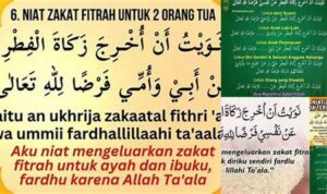 • Transliterasi Latin: Nawaitu an ukhrija zakatal fitri ‘an (sebutkan nama) fardhan lillahi ta’ala.
