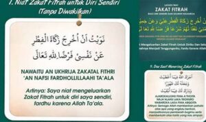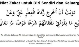 • Transliterasi Latin: Nawaitu an ukhrija zakatal fitri ‘anni wa ‘an jami’i man yalzamuni nafaqatuhum fardhan lillahi ta’ala.