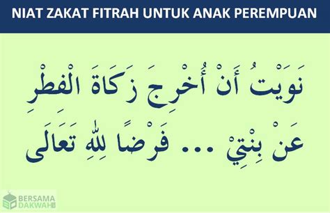 - Lafaz Arab: نَوَيْتُ أَنْ أُخْرِجَ زَكَاةَ الْفِطْرِ عَنْ بِنْتِيْ فُلَانَةِ الْاِسْمِ فَرْضًا لِلَّهِ تَعَالَى